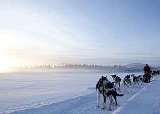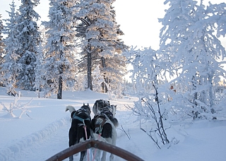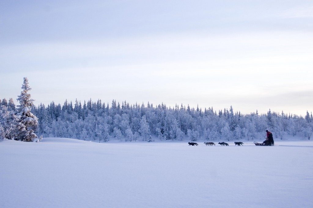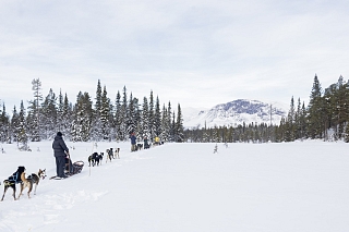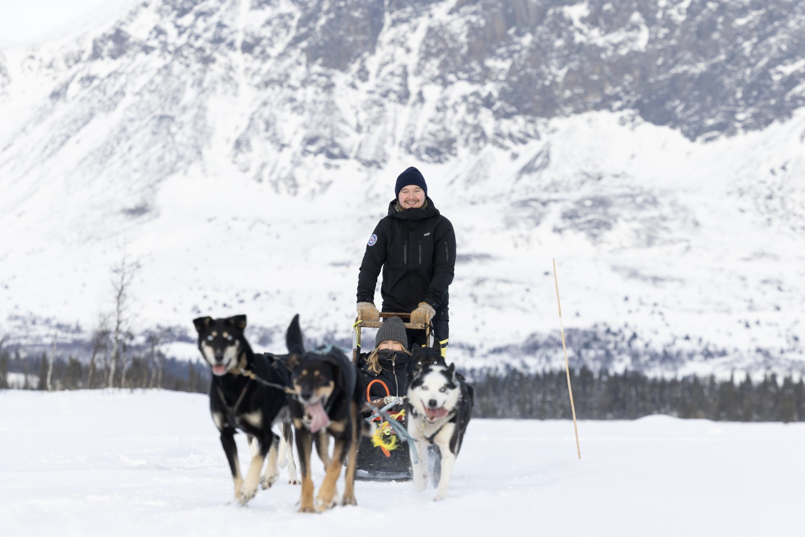 De husky's trekken je slee over bevroren meren en door besneeuwde bossen. De één zit comfortabel voorop, de ander staat achterop en bestuurt de slee. Je kunt ook samen met je kind voorop zitten!