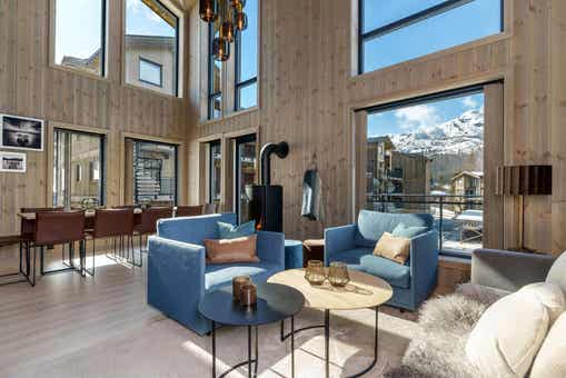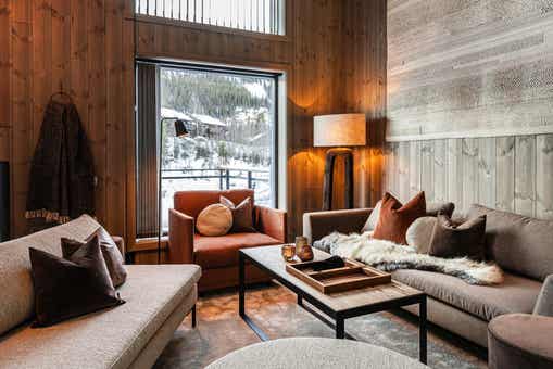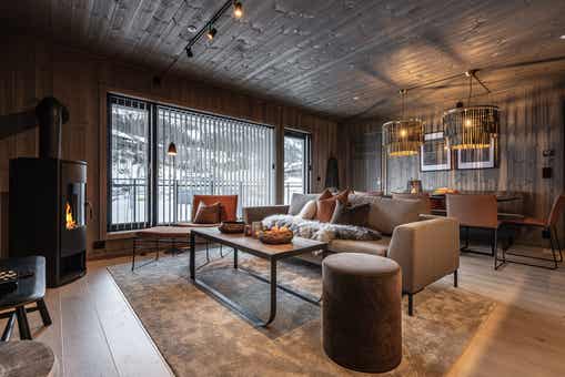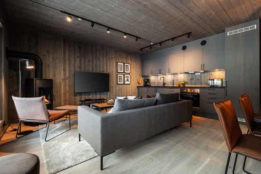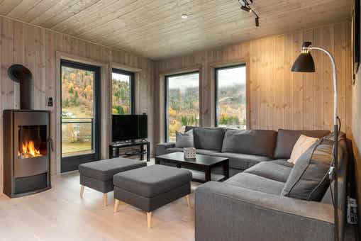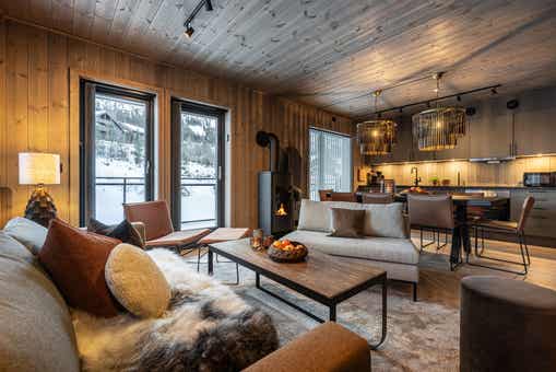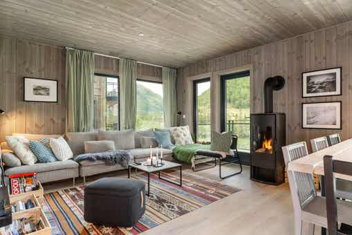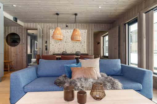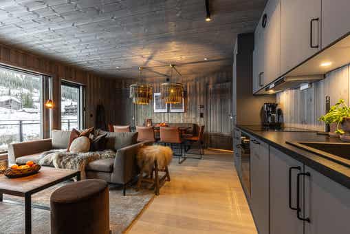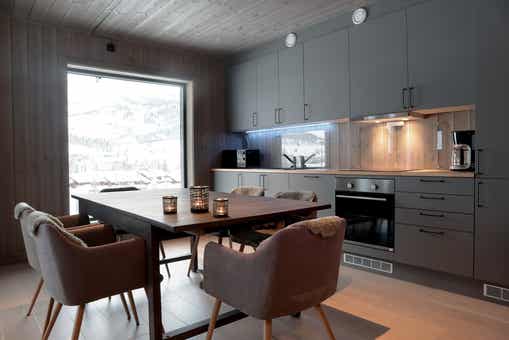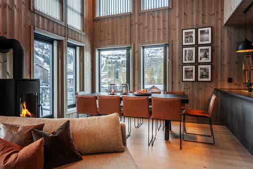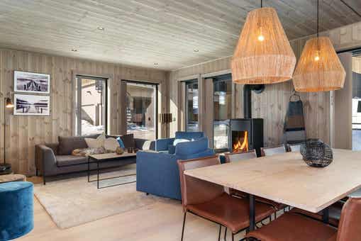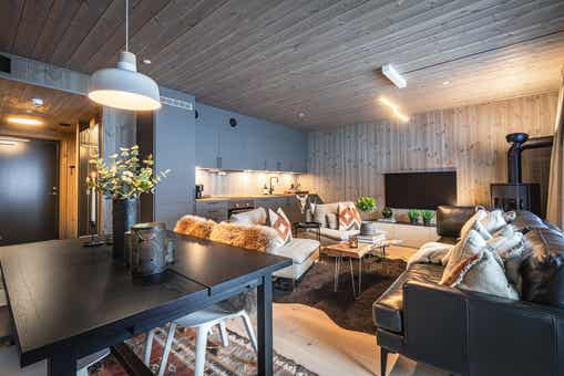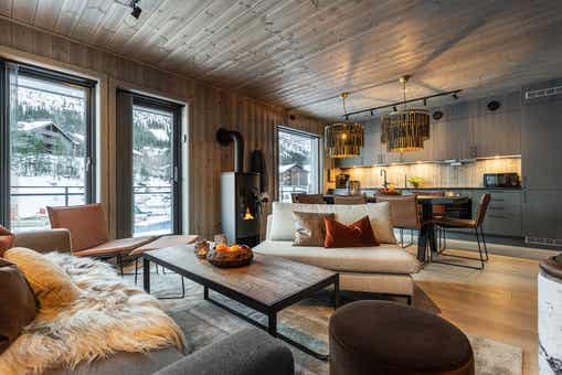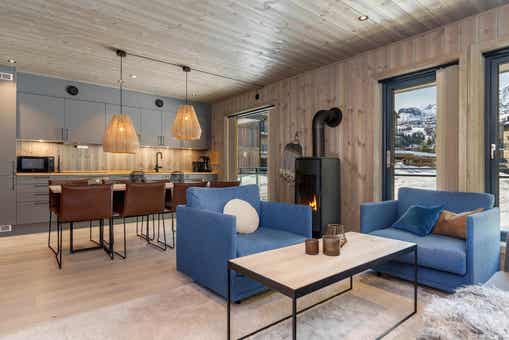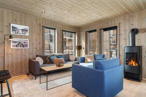 Fjellnest bevindt zich in Hemsedal Skisenter. Appartement van twee verdiepingen op de 3e verdieping met extra woonkamer op de 2e verdieping, 10 bedden, 116 m², woonkamer met gecombineerde keuken, 4 slaapkamers, 2 douches, 2 toiletten, bouwjaar 2023.
