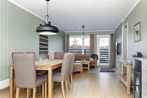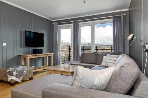 Skarsnuten Panorama bevindt zich in Hemsedal Skisenter. Hoekappartement, 9 bedden, 80 m², woonkamer met gecombineerde keuken, 3 slaapkamers, 2 douches, 2 WC, sauna.