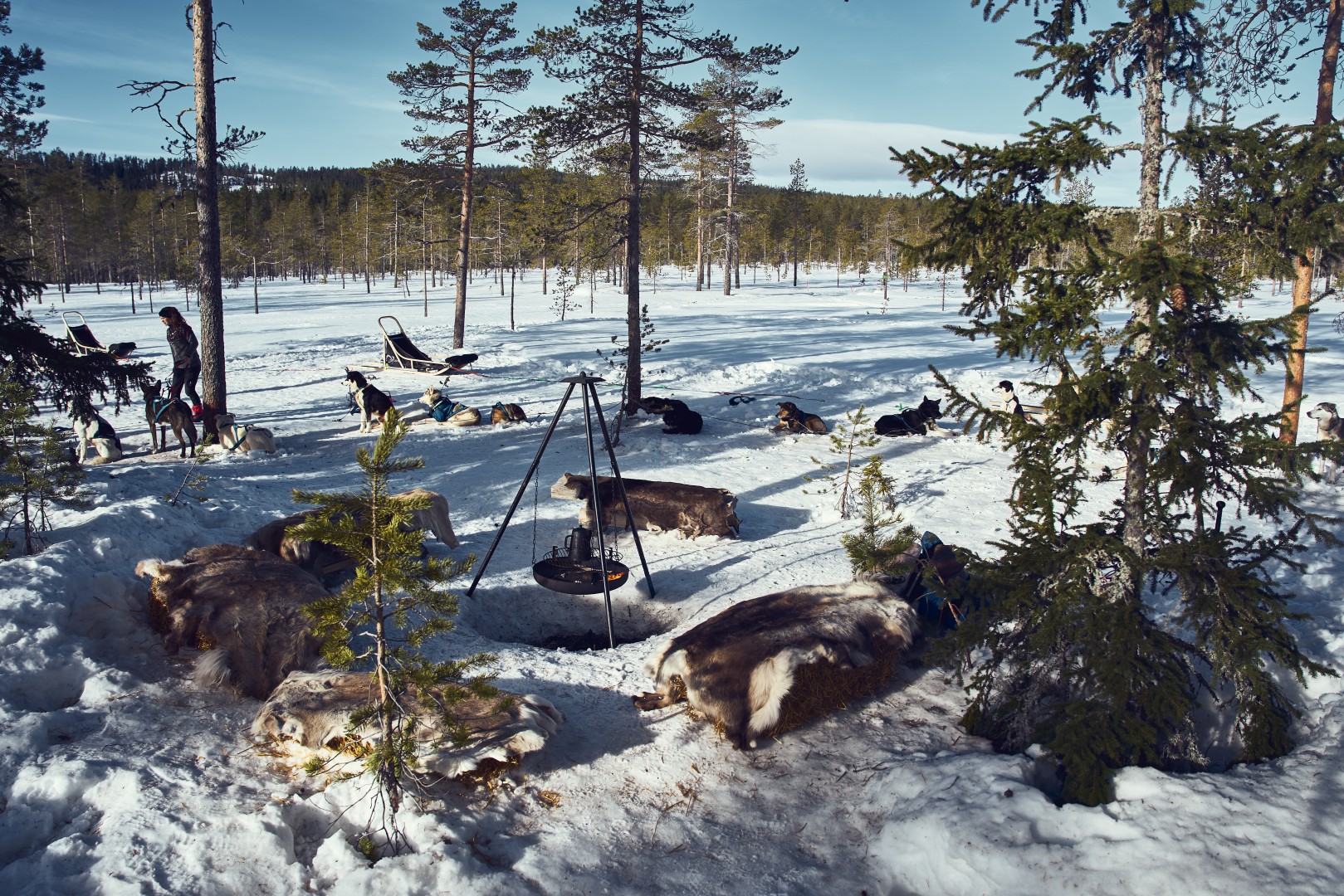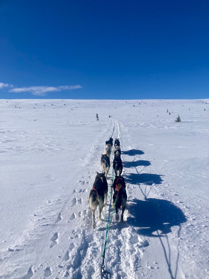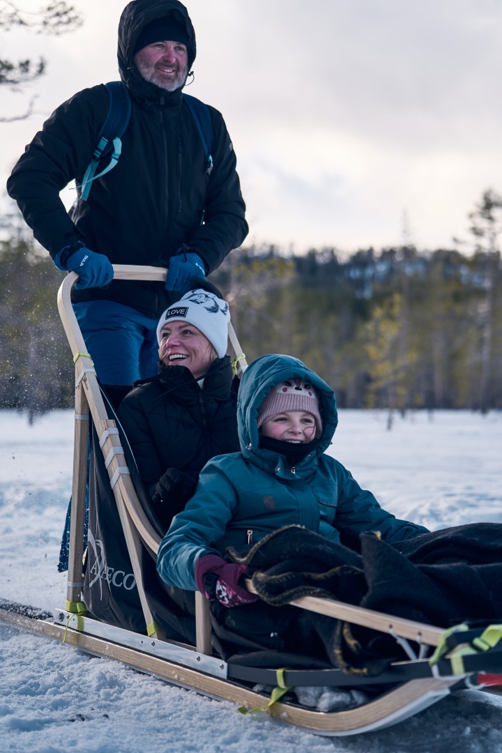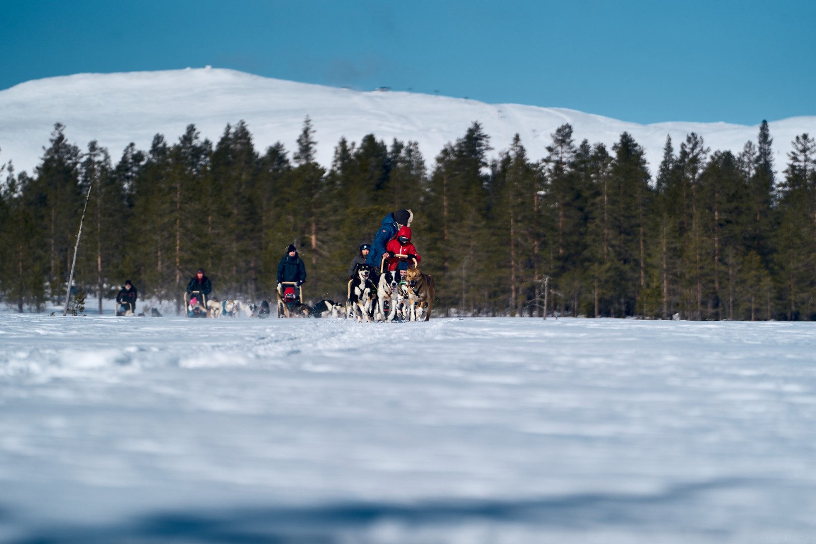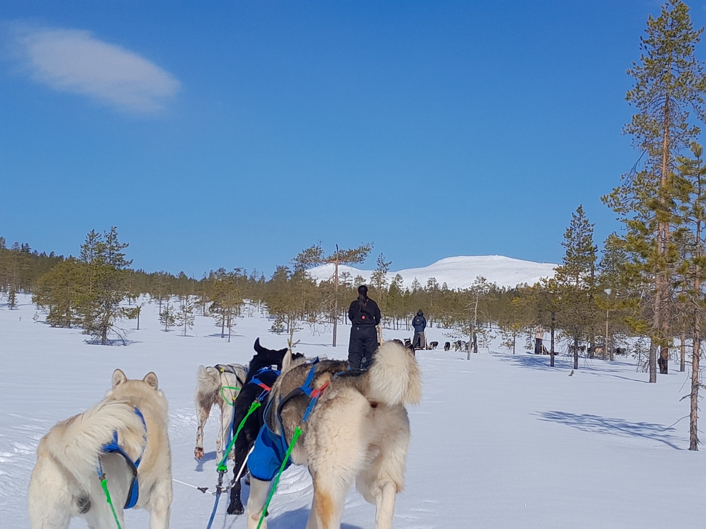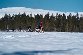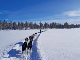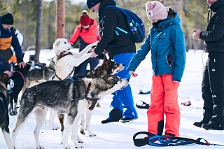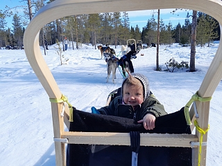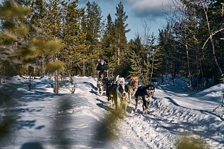 Ineens stopt het geblaf, het avontuur begint nu echt, de husky's trekken je slee door de besneeuwde bossen en over de bevroren meren. De één zit comfortabel voorop en kan mooie foto’s maken, de ander staat achterop en bestuurt de slee. Het is mogelijk om samen met je kind voorop te zitten...