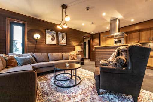 Woonkamer met gecombineerde keuken. TV, open haard (hout is niet inbegrepen), droogkast, wasmachine, berging voor ski's, balkon (geen sneeuwruimen).